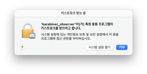 그러면 시스템에서 키보드의 키스트로크를 karabiner-observer 프로그램이 가져가려고한다는 경고를 띄운다. '시스템 설정 열기'를 눌러서 설정해주자.