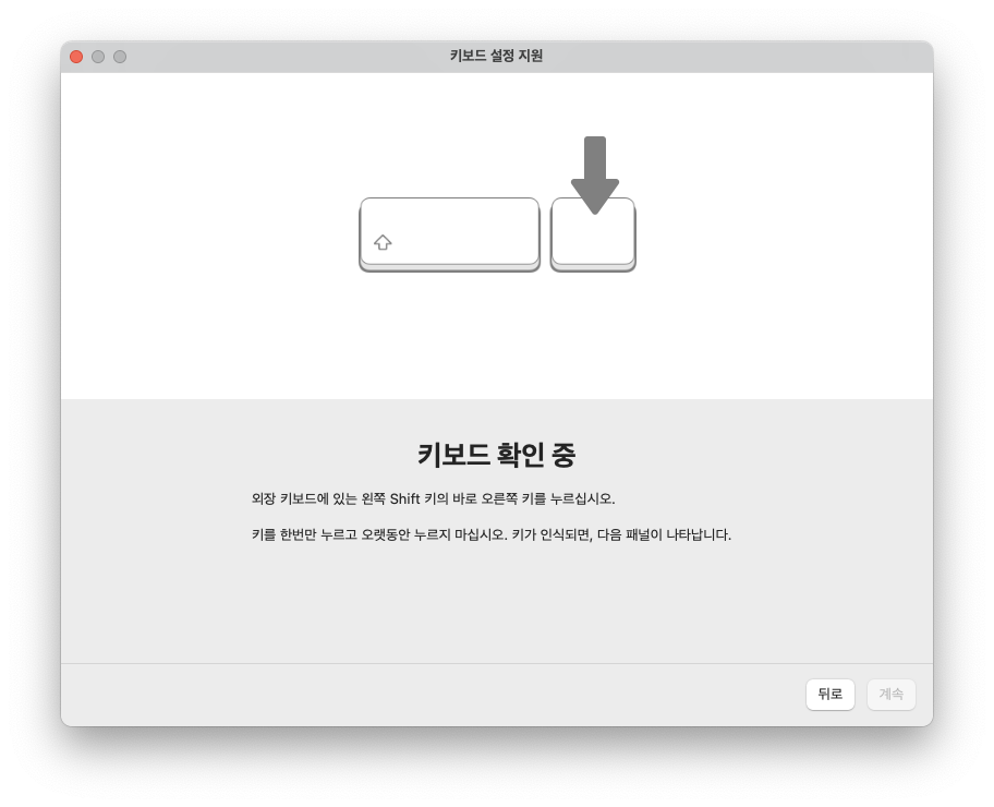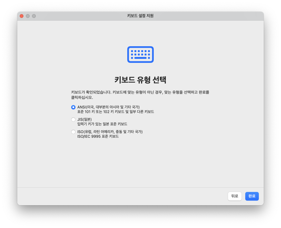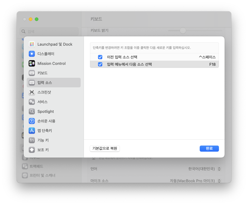완료를 누르면 시스템에서 오른쪽 Command 키를 한영 전환키로 사용할 수 있게 된다.