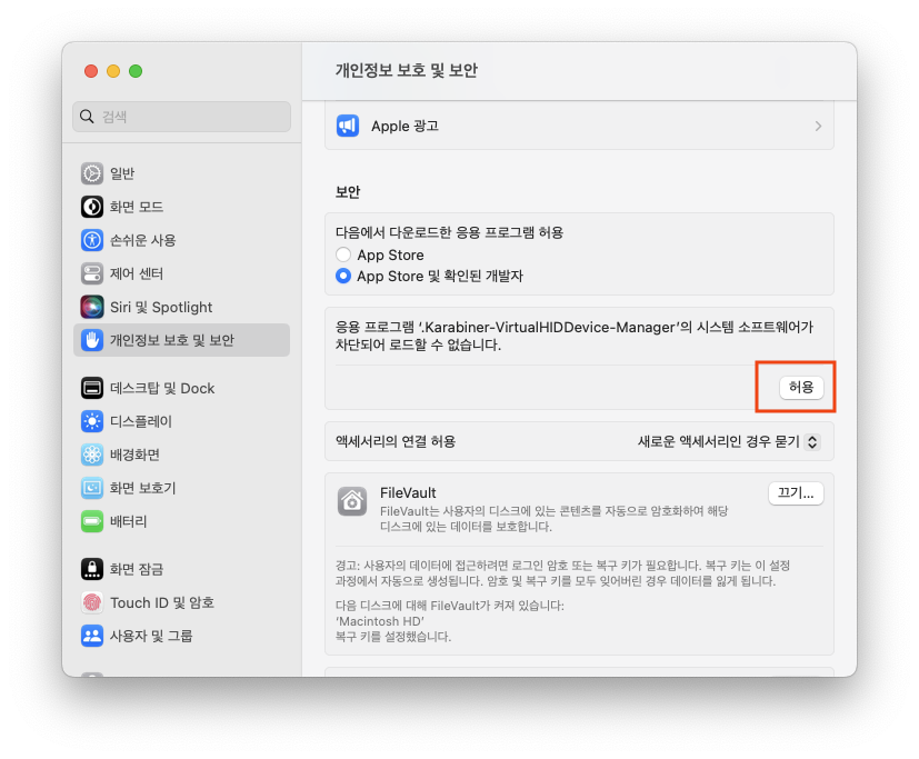 그리고 바로 위 메뉴로 올라가서 Karabiner-VirtualHIDDevice-Manager의 차단을 '허용'해준다.