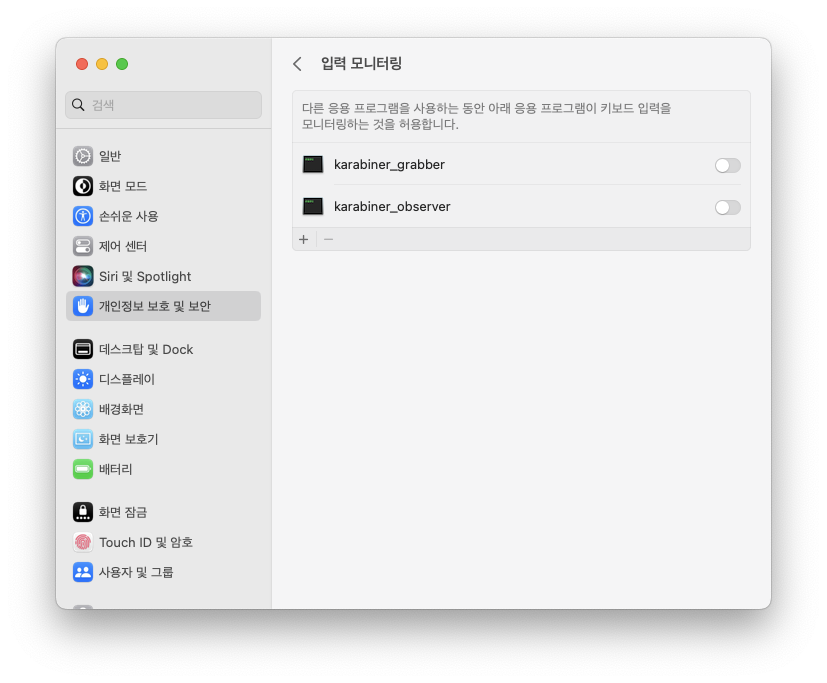 입력 모니터링에 karabiner 관련 두개의 항목이 추가되었다. 이걸 활성화해주자.