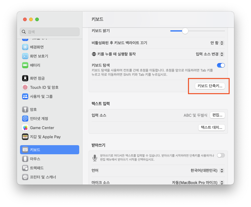 다시 설정 앱으로 돌아가서 '키보드' 메뉴로 들어가면 '키보드 단축키' 버튼을 찾아서 눌러주자.