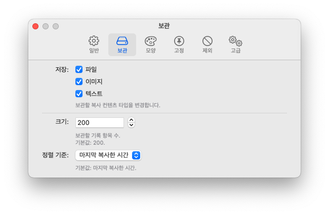보관 탭에서는 클립보드로 복사되는 데이터 중 히스토리 관리를 하고 싶은 종류를 선택할 수 있다. 파일이나 이미지, 텍스트 중에 원하는 데이터만 히스토리 관리를 할 수 있다.