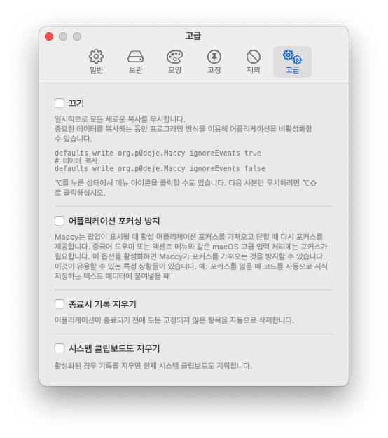 maccy의 기능을 끄거나 앱 포커싱 방지기능, 앱 종료시 히스토리도 삭제하는 기능을 설정할 수 있다.