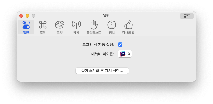 일반 탭에서는 로그인시 AltTab 앱을 자동실행할 것인지 여부를 선택할 수 있다. 사용법이 익숙해지면 자주 쓸 것이므로 자동실행 체크를 해주자.