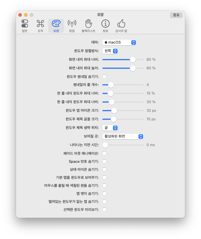 모양 탭에서는 AltTab 앱의 테마와 너비, 높이, 썸네일의 개수 같은 것들을 설정할 수 있다.