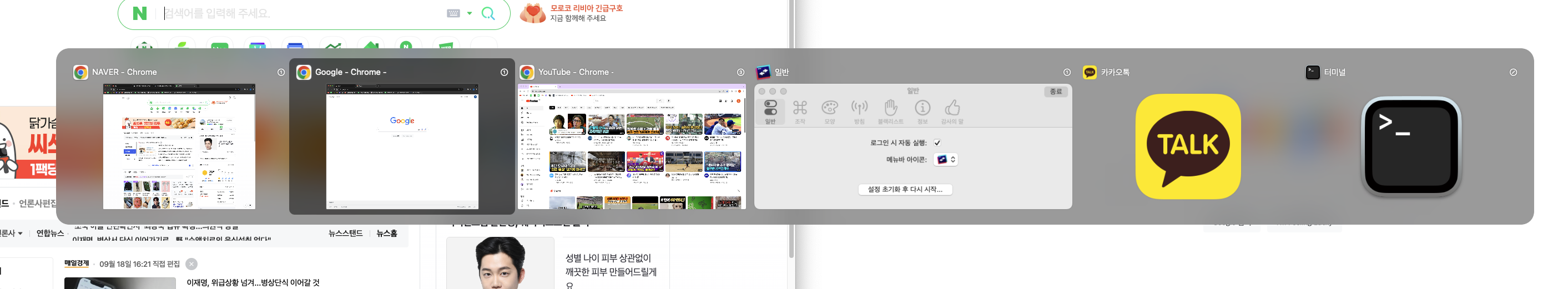 맥북과 윈도우는 [Alt] + [Tab] 키의 동작이 다르다. 윈도우는 [Alt] + [Tab] 키를 눌러 띄워져 있는 창 단위로 전환해서 활성화를 시킨다. 반면 맥북은 창 단위가 아닌 앱 단위로 전환된다.