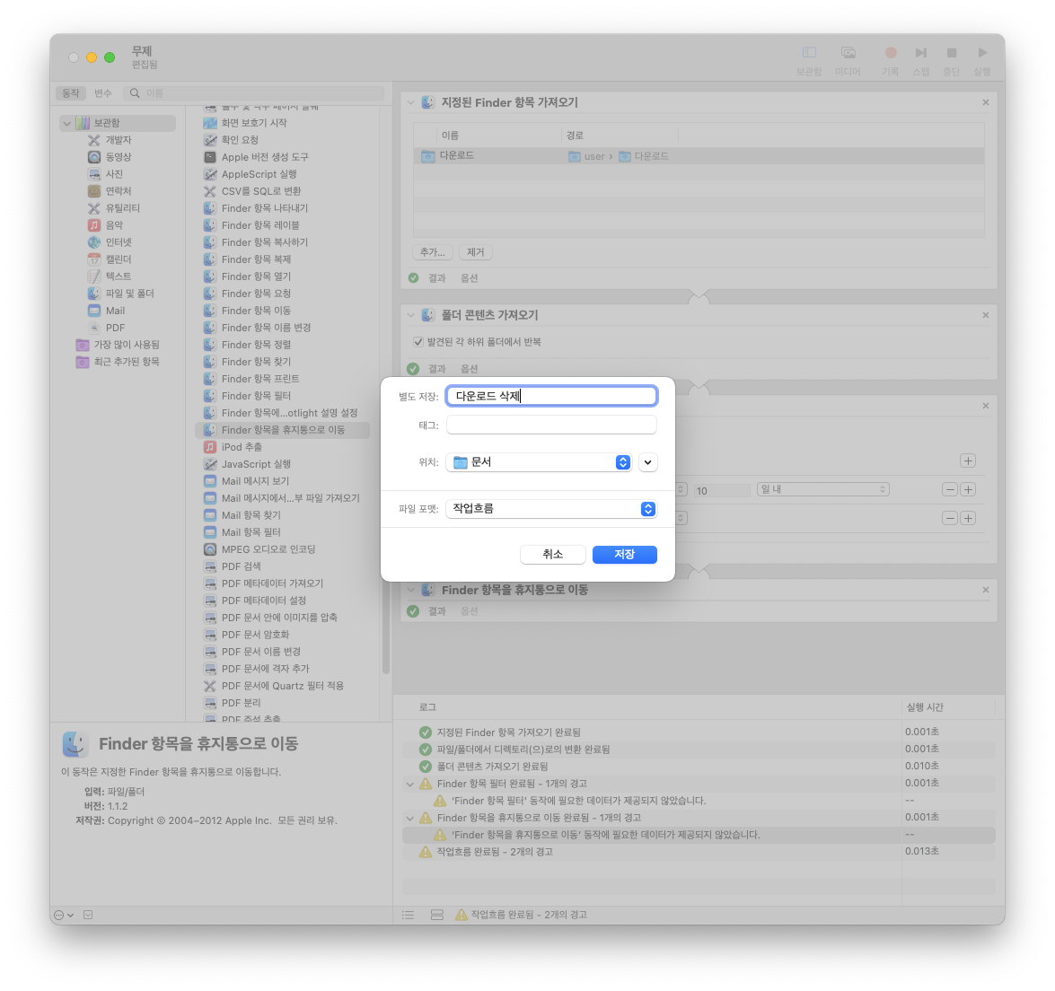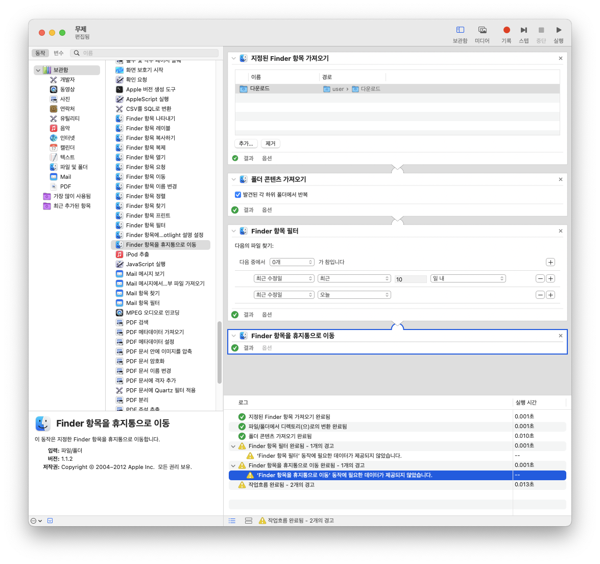 그러면 Finder에서 다운로드 디렉토리의 하위디렉토리를 포함한 모든 콘텐츠를 읽어들인 다음 필터링을해서 휴지통으로 이동시키는 자동화 작업 앱이 만들어졌습니다.