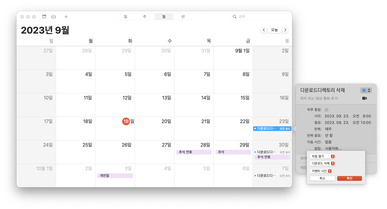 맥의 기본 캘린더 앱을 열고 새로운 일정을 만듭니다.