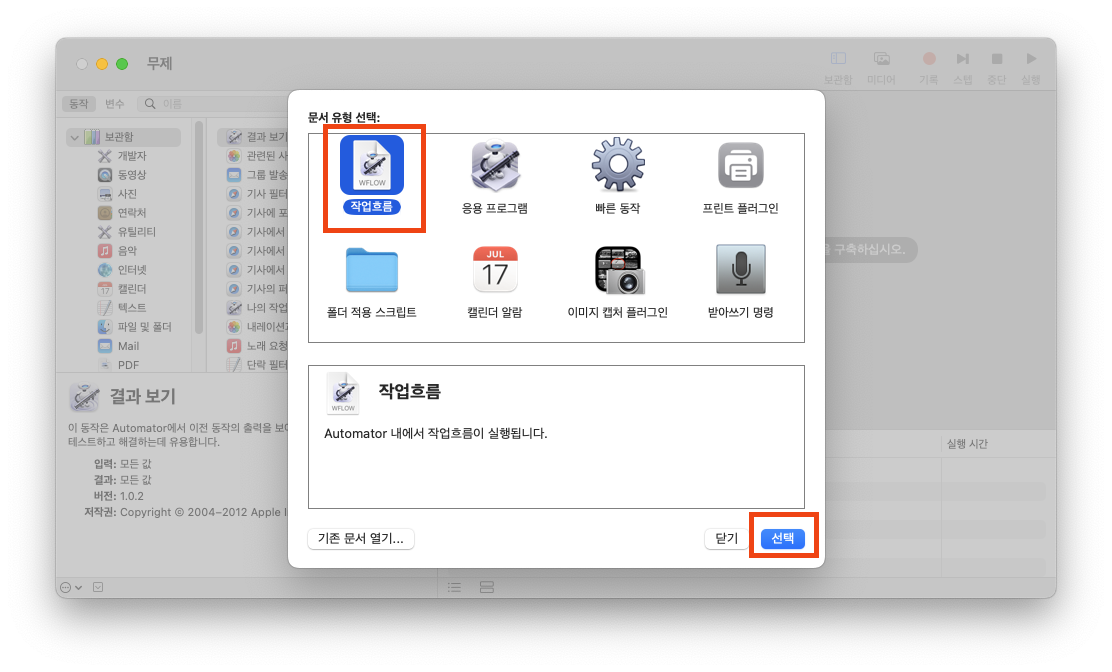 Automator를 실행한 다음 '작업흐름'을 선택합니다.