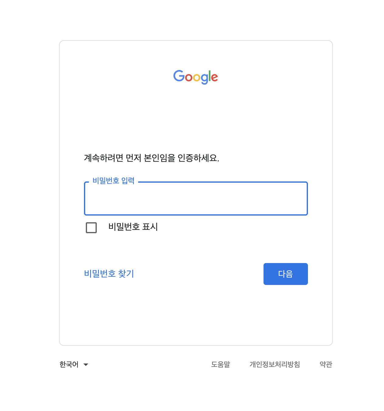 구글 계정의 보안 설정을 바꾸는 작업이기 때문에 비밀번호를 한번 더 입력해서 본인 확인을 해야한다. 비밀번호를 입력하자.