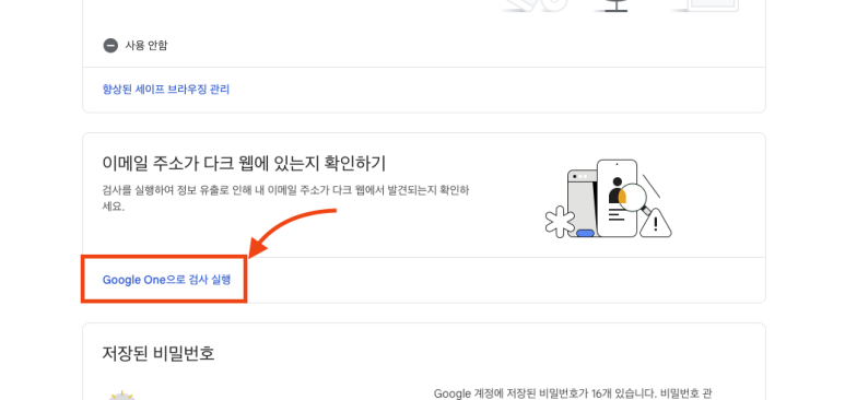 보안 페이지에서 스크롤을 내려보면 'Google One으로 검사실행'이라는 항목을 찾을 수 있다. Google One으로 검사 실행 항목을 클릭한다.