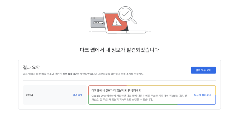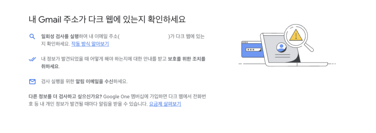구글에서는 Google One의 멤버십 상품으로 다크 웹에서 전화번호나 이메일 주소 같은 개인정보가 발견될 때마다 알림을 받을 수 있는 기능을 제공하고 있다. 필요하다면 결제를 하고 멤버십에 가입하면 된다.
