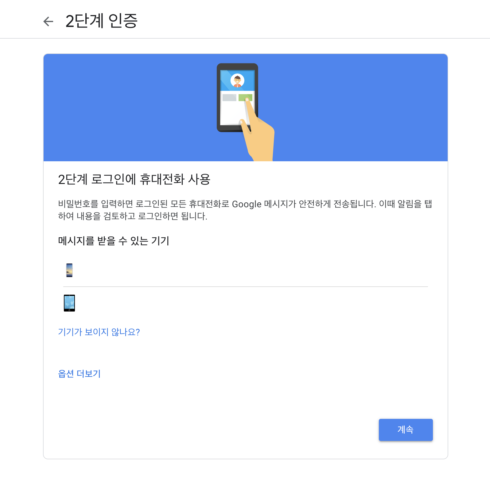 비밀번호를 입력하면 현재 구글 계정이 로그인되어 있는 디바이스들의 목록을 볼 수 있다. 여기에 있는 디바이스 중 적어도 하나는 손에 들고 있어야 한다. '계속' 버튼을 누른다.