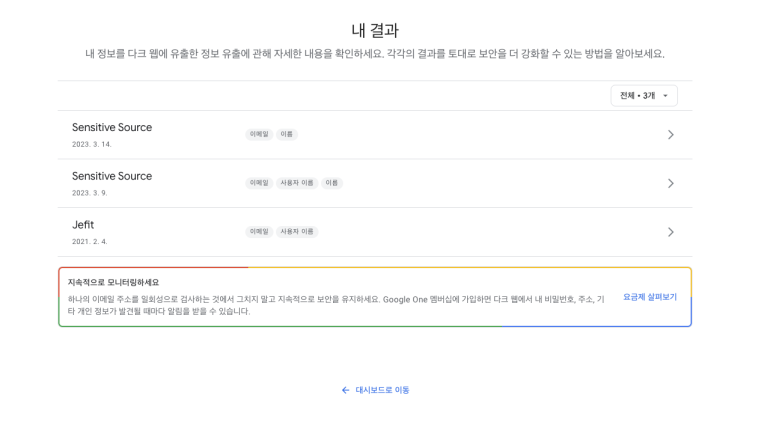 일회성 검사를 통해서도 개인정보가 다크웹에 있는지 검사할 수 있다. '결과 모두 보기' 버튼을 클릭하면 어떤 정보들이 다크웹에서 발견되었는지 상세히 리포트 받을 수 있다.