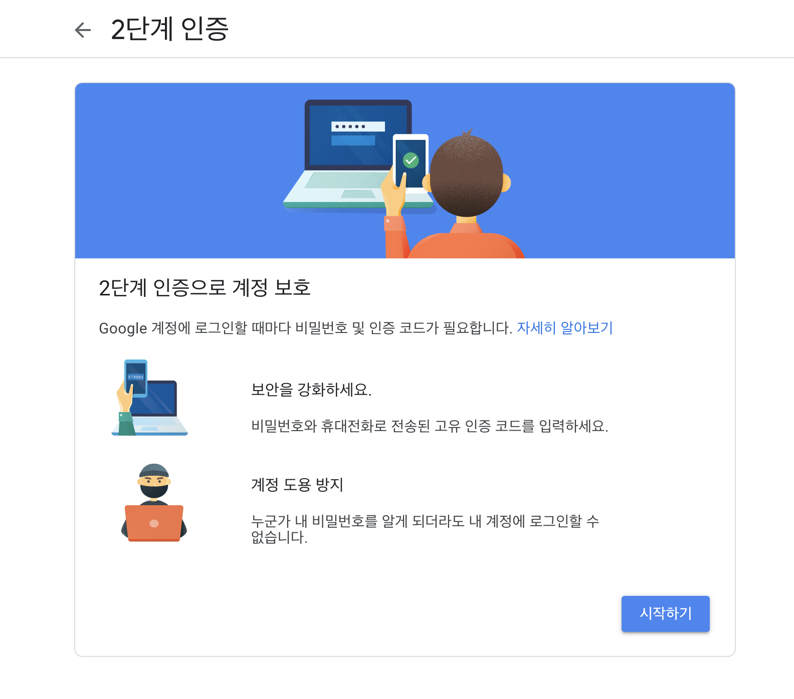 구글의 2단계 인증에 대한 간단한 안내가 나온다. '시작하기' 버튼을 클릭한다.