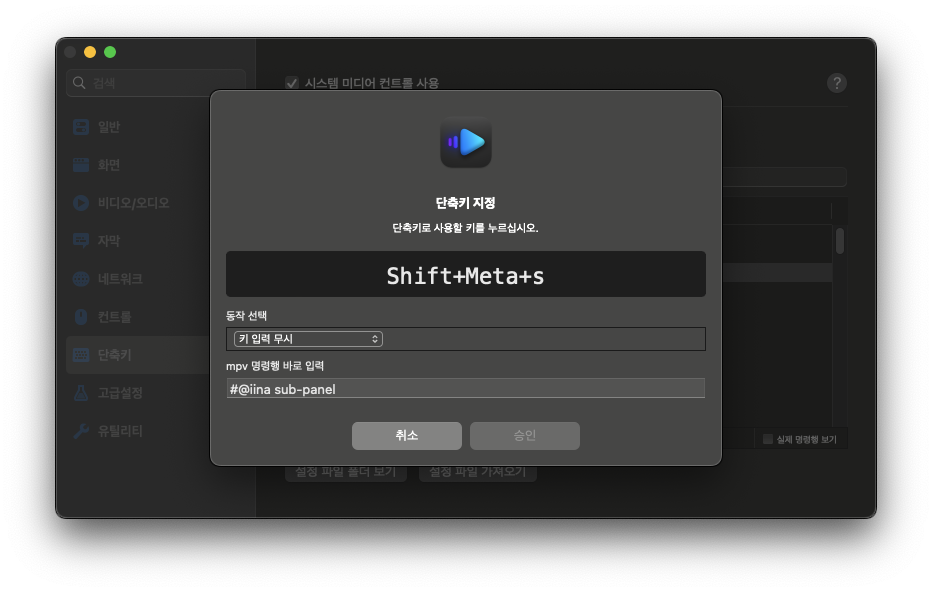 다른 동영상 플레이어들처럼 IINA도 단축키를 지원한다. 그리고 사용자가 단축키를 커스터마이징 할 수 있는 기능도 지원한다. [Cmd] + [,] 키를 이용해서 설정 창으로 들어가자.