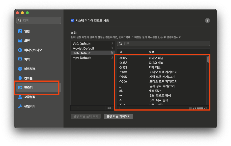 설정 창 왼쪽 '단축키' 탭으로 들어가면 IINA에서 사용할 수 있는 단축키들의 리스트를 볼 수 있다. IINA의 기본 설정에서는 단축키를 변경할 수 없다. 대신 설정을 복제해서 변경하는 방식으로 단축키 수정이 가능하다.