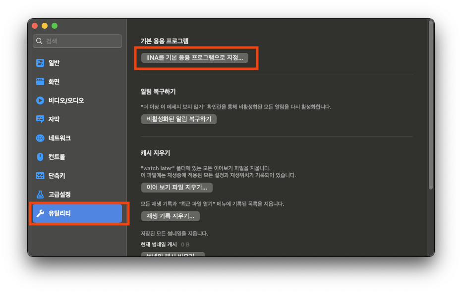설정 창 왼쪽에 있는 메뉴 중 '유틸리티' 탭으로 들어가면, 맨 위쪽에 'IINA를 기본 응용 프로그램으로 지정..' 버튼이 있다. 이 버튼을 클릭하자.