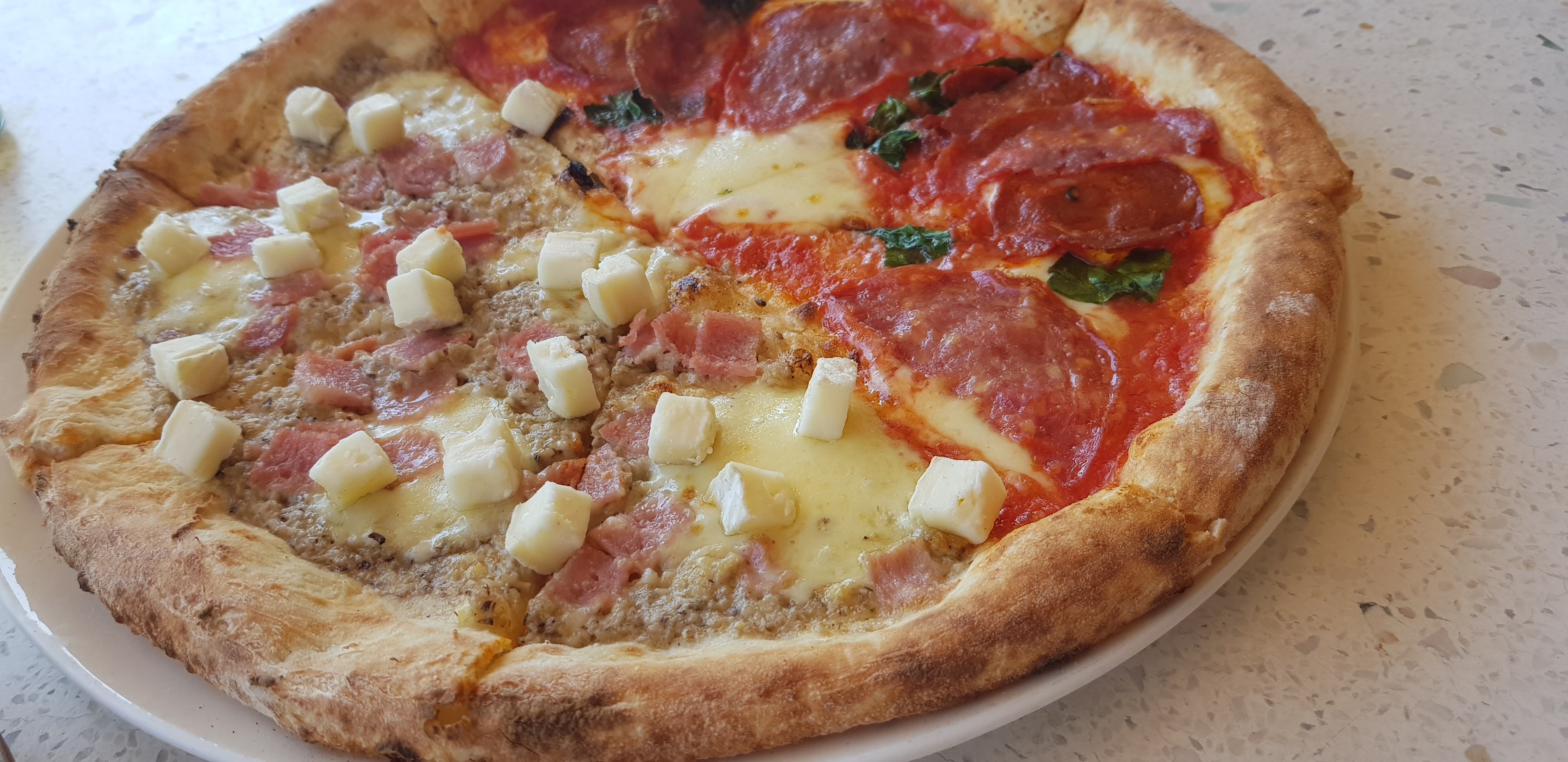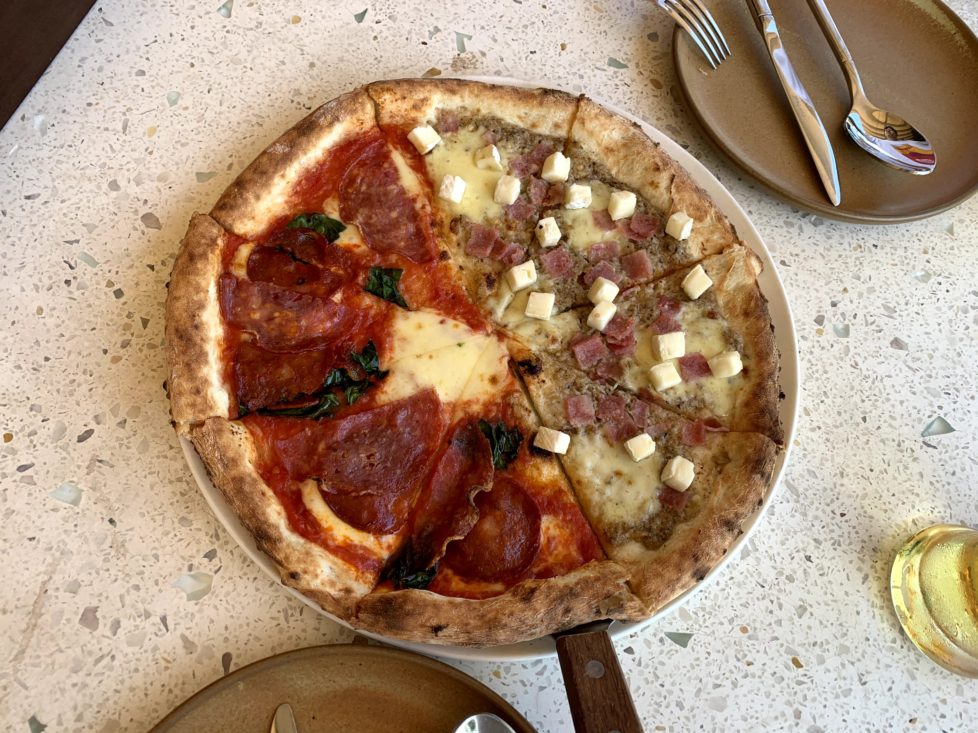 맥주를 마시다보니 피자가 나왔습니다. 주문할 때 뭘 먹으면 좋겠냐고 물어봤는데, 이 메뉴를 추천해줬습니다. 두 가지 맛이 섞인 피자입니다.