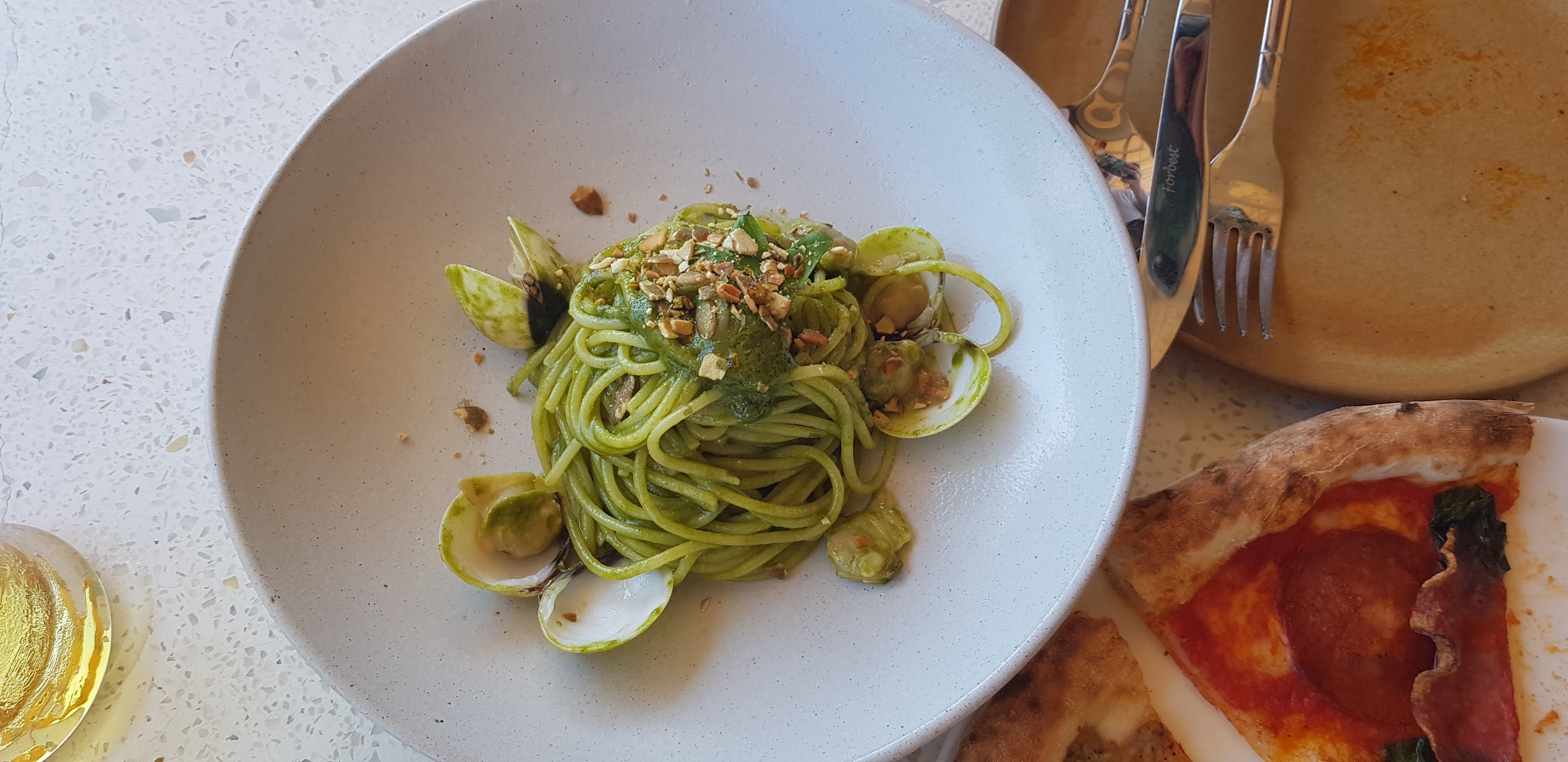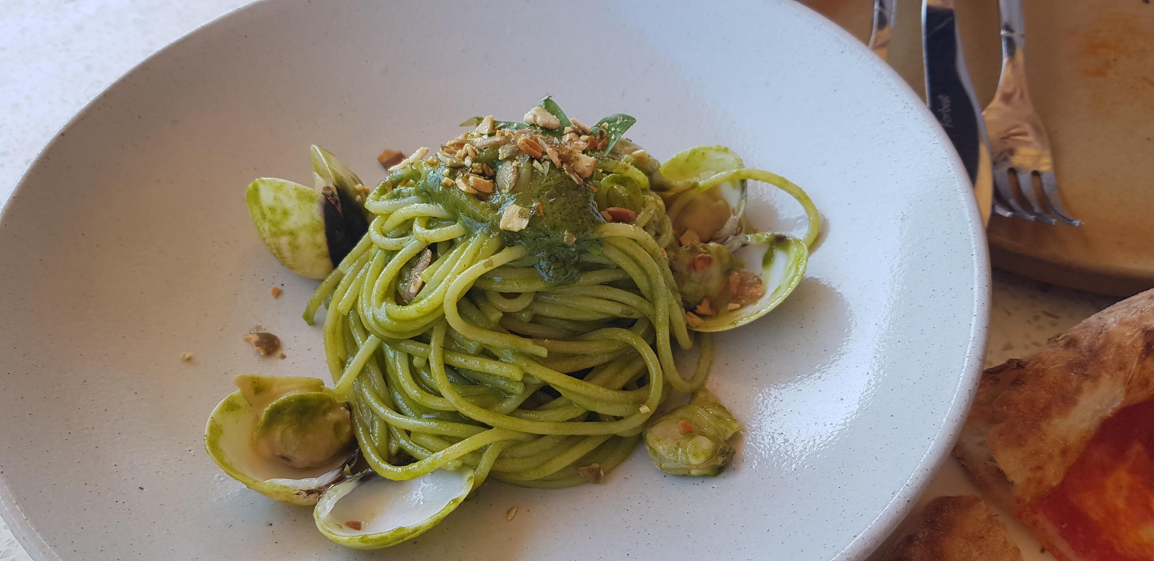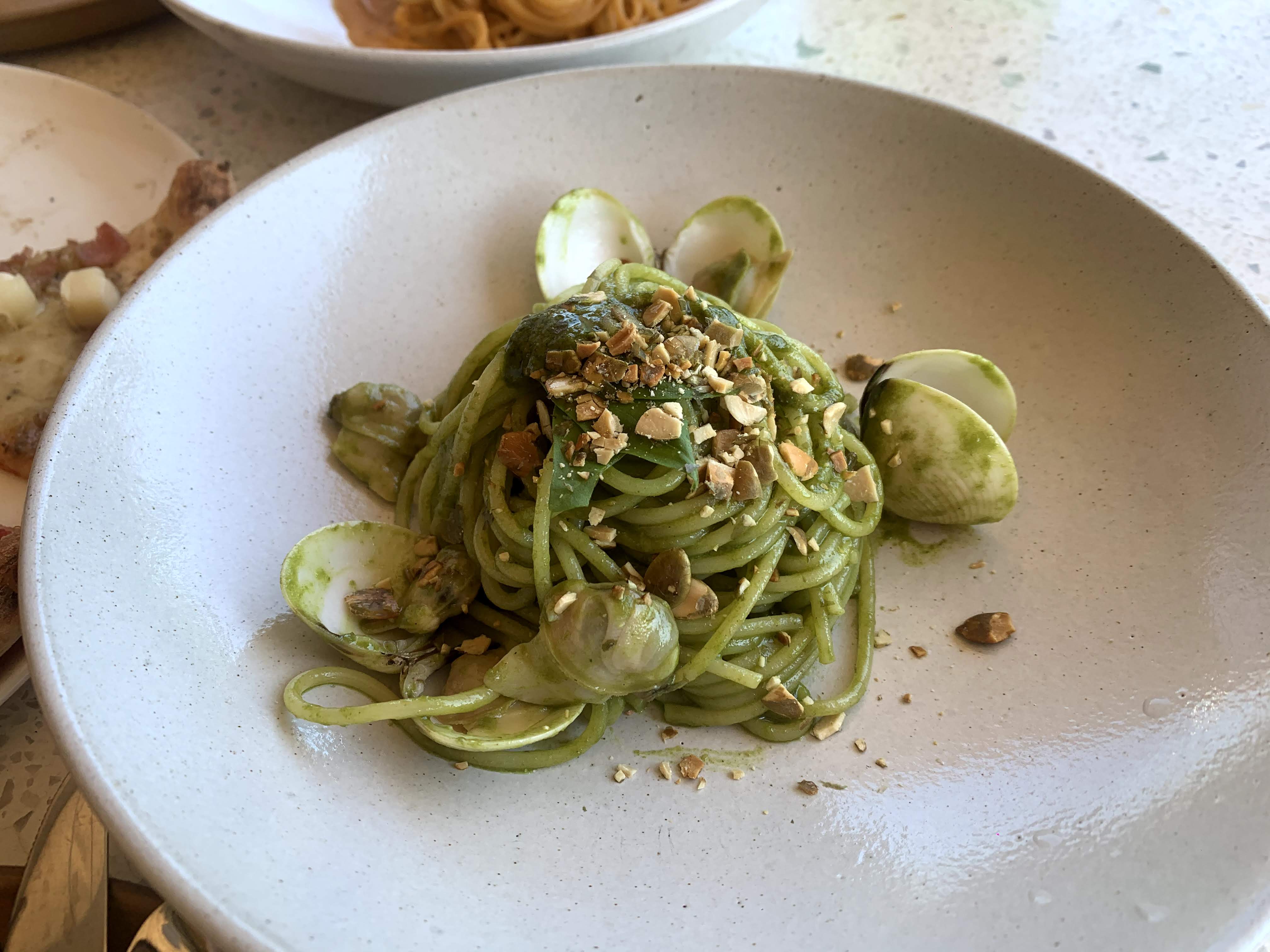 녹색의 파스타는 녹색 맛이 납니다. 비왔을 때 느낄 수 있는 풀밭의 향기 같은 맛이 납니다. 더 쉽게 말하면 녹차라떼같은 맛? ㅋㅋㅋ 맛있습니다.