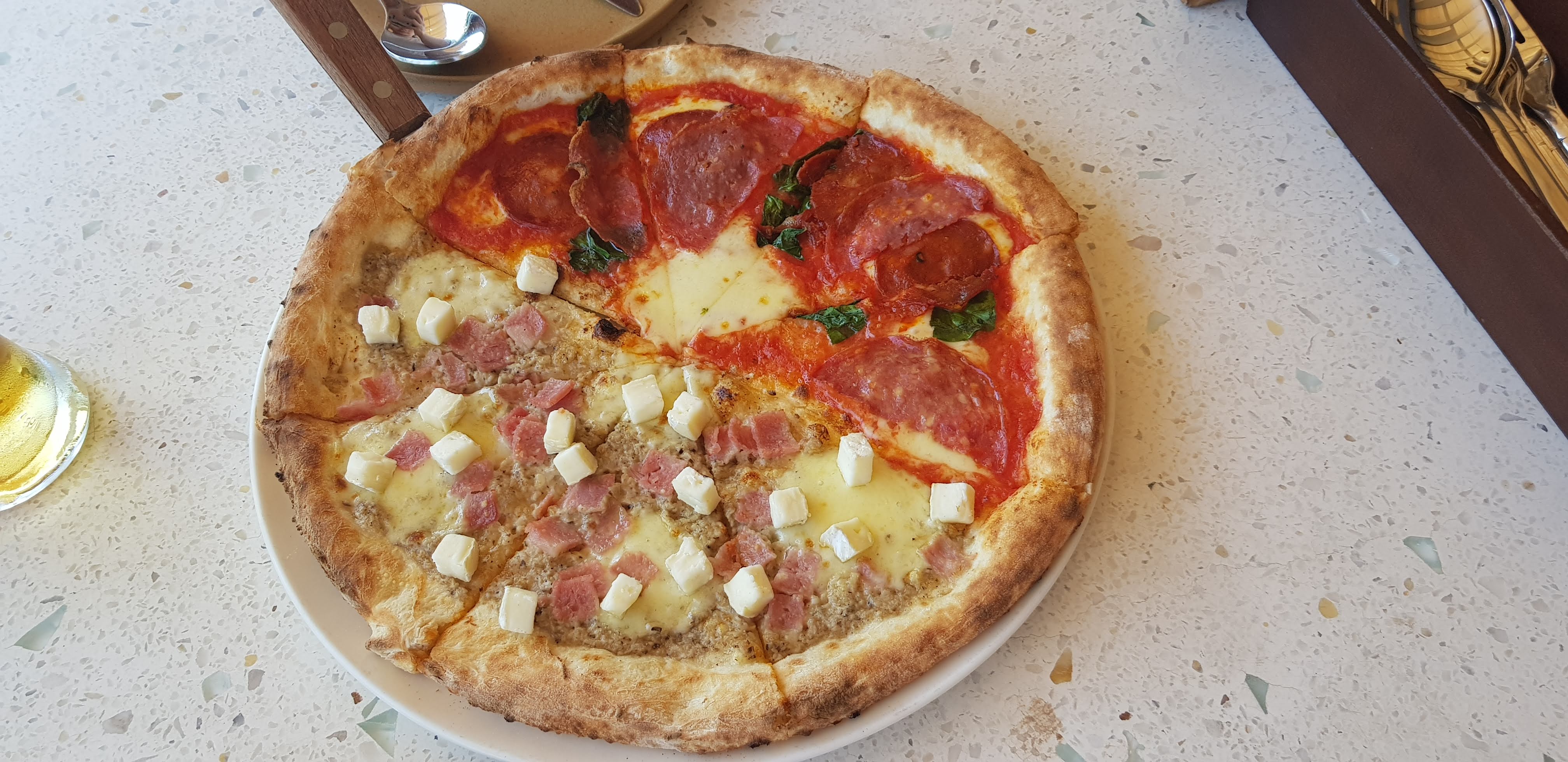 맥주를 마시다보니 피자가 나왔습니다. 주문할 때 뭘 먹으면 좋겠냐고 물어봤는데, 이 메뉴를 추천해줬습니다. 두 가지 맛이 섞인 피자입니다.