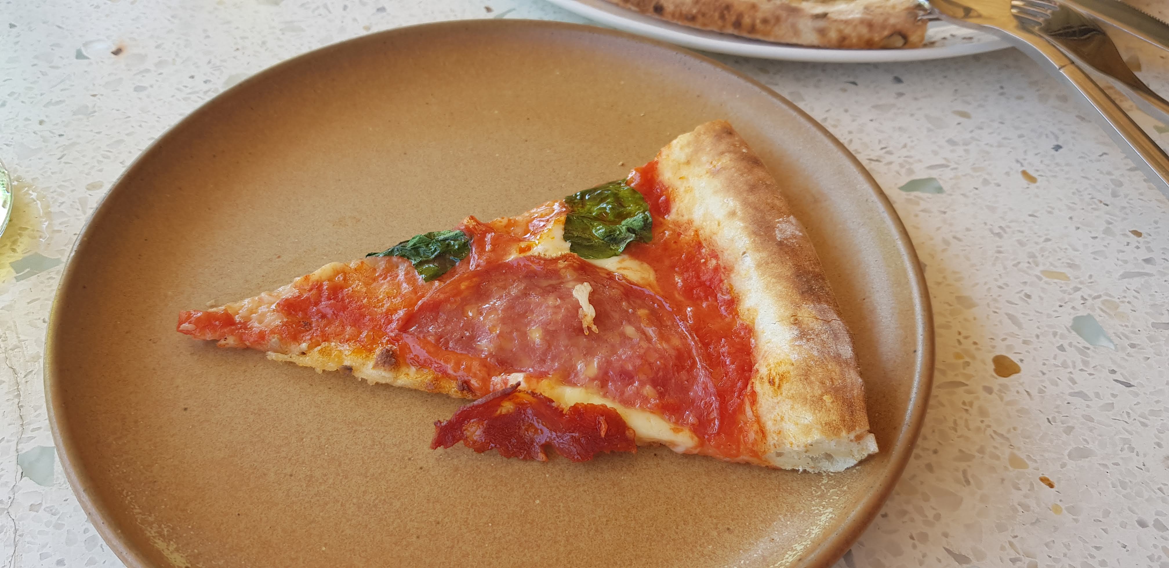 빨간색 피자는 핫 소스를 뿌려 먹으면 맛있습니다. 굉장히 얇아서 한 조각이 한입에 다들어갈 수 있습니다.
