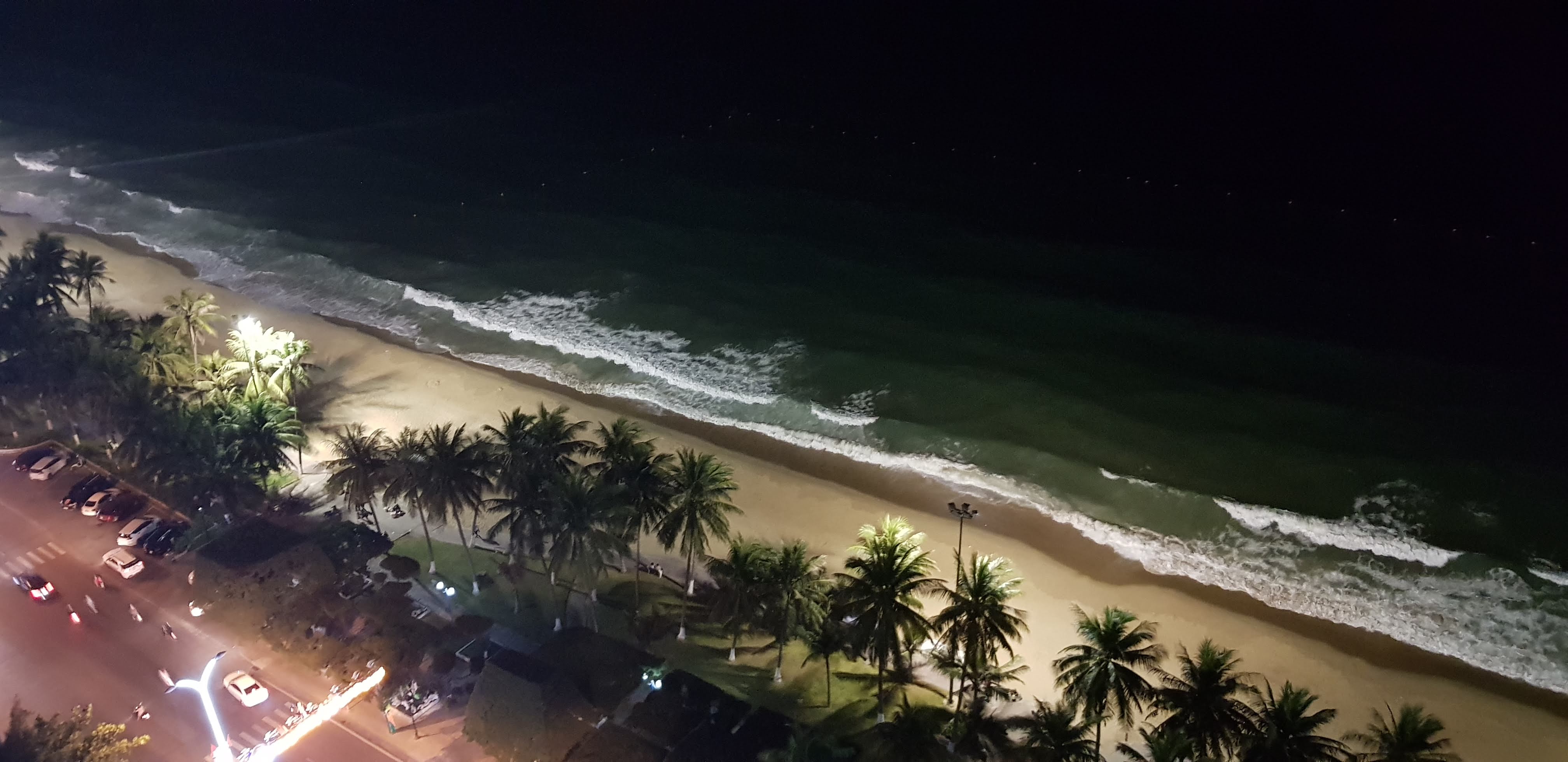 파란색 나트랑 해변이 밤에는 조명으로 멋지게 빛납니다.