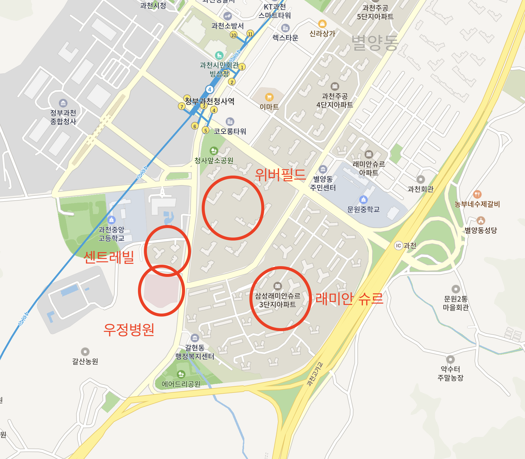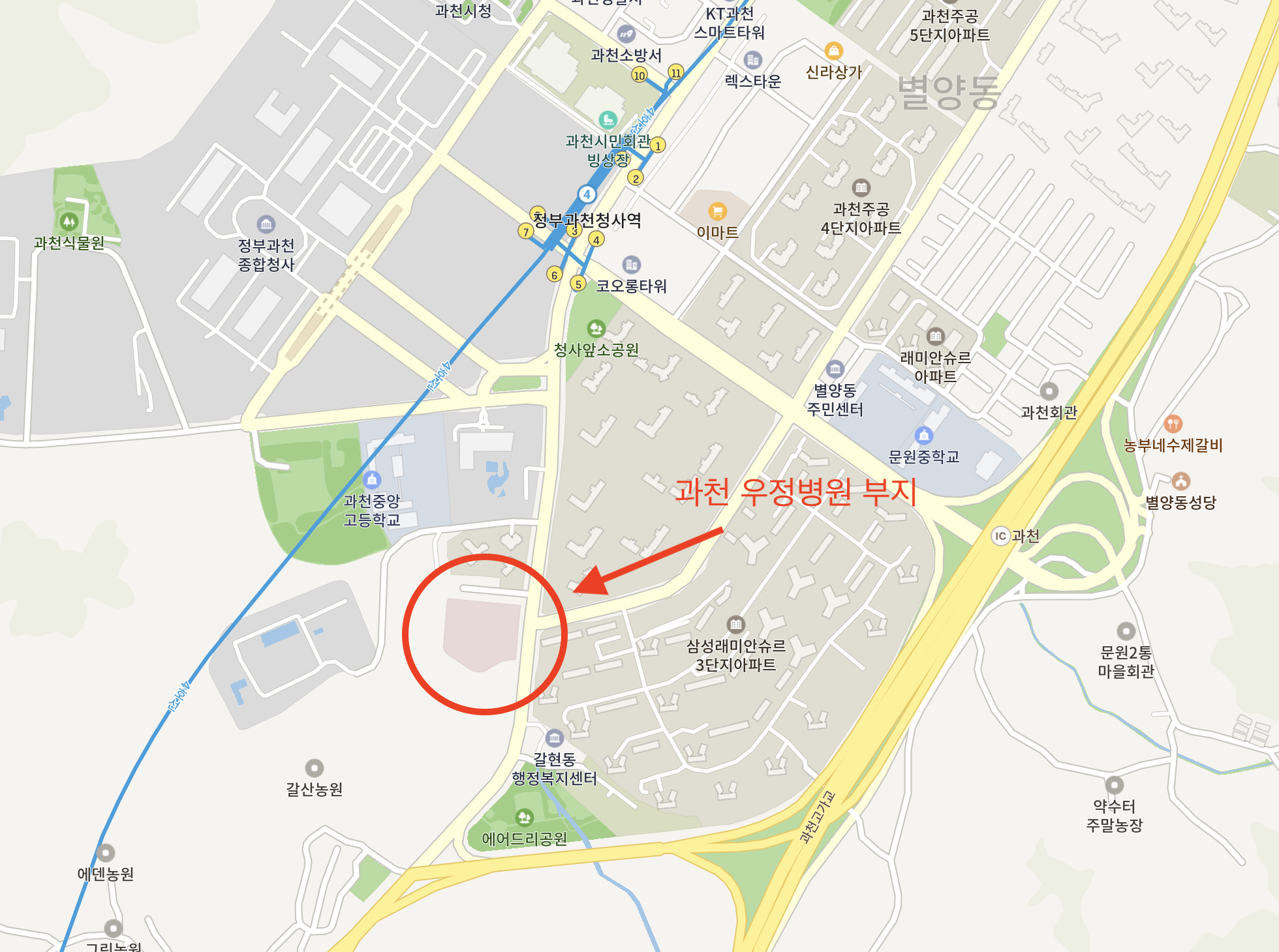 우정병원 부지는 지하철 4호선 정부과천청사역까지 도보 5분 거리에 있는 알짜 입지를 가지고 있습니다. 또 한, GTX-C 노선과 위과선 노선의 수혜를 입을 것으로 예상되며, 평촌에서 서울로 나가는 다수의 버스가 단지 바로 앞을 지나는 엄청나게 좋은 입지를 가지고 있습니다.