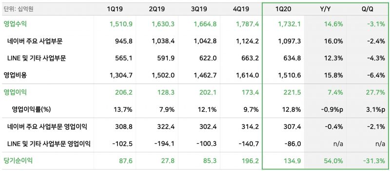네이버의 2020년 1분기 실적은 매출이 전녀동기 대비 14.6% 성장해 1조 7321억원, 영업이익이 전년동기 대비 7.4% 증가한 2215억원, 당기 순이익은 54% 성장한 1349억원을 기록했습니다.