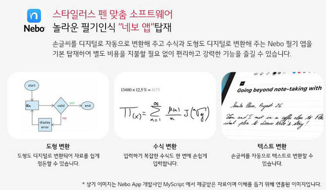 LG 벨벳에는 필기인식 어플인 '네보(Nebo) 앱'이 탑재되어 있습니다. 네보 앱을 이용해 손글씨 자동 변환과 수식, 도형 변환 기능을 이용할 수 있습니다.