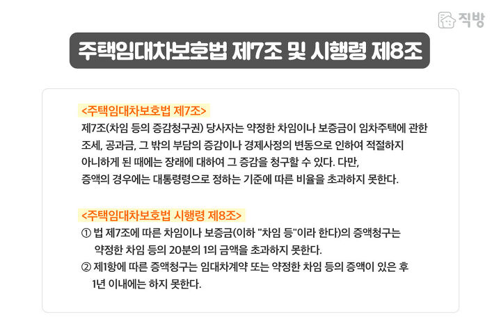 집주인은 세입자와 재계약을 할 때 보증금을 증액청구 할 수 있습니다. 더 올려받겠다는 거죠. 하지만 올려받는 금액은 약정한 차임 등의 20분의 1 금액을 초과하지 못합니다. 즉 5% 이상 올려받을 수 없습니다. 상대적으로 약자인 세입자를 보호하기위한 법적 장치죠.