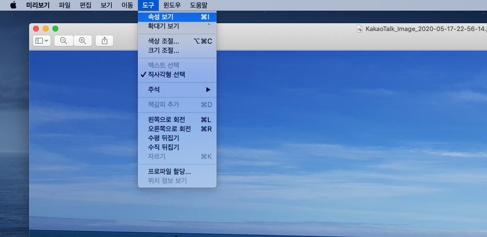 '미리보기(Preview)' 앱을 이용해 사진을 열고, 상단의 [도구] 옵션을 클릭한다음 [속성 보기]를 선택합니다.