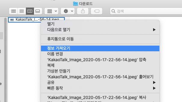 혹은 파인더나 데스크탑에 있는 아이콘을 우클릭하여 '정보 가져오기'를 클릭해 이미지 파일의 EXIF 정보를 가져 올 수 있습니다.