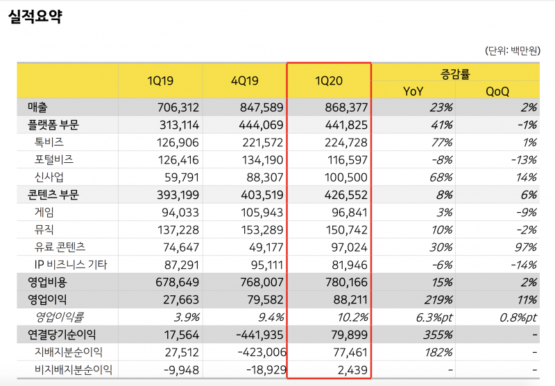 카카오의 2020년 1분기 매출은 8684억원, 영업이익은 882억원, 당기 순이익은 775억원으로 전년 동기대비 매출은 22.9%, 영업이익은 218.9%, 당기순이익은 354.9% 성장했습니다. 전분기 대비로는 매출이 2.5%, 영업이익이 10.8%, 당기순이익은 흑자전환했습니다.영업이익률도 10.2%를 기록하며 2015년 1분기 17.2% 이후 5년만에 처음으로 두자리수를 기록했습니다.