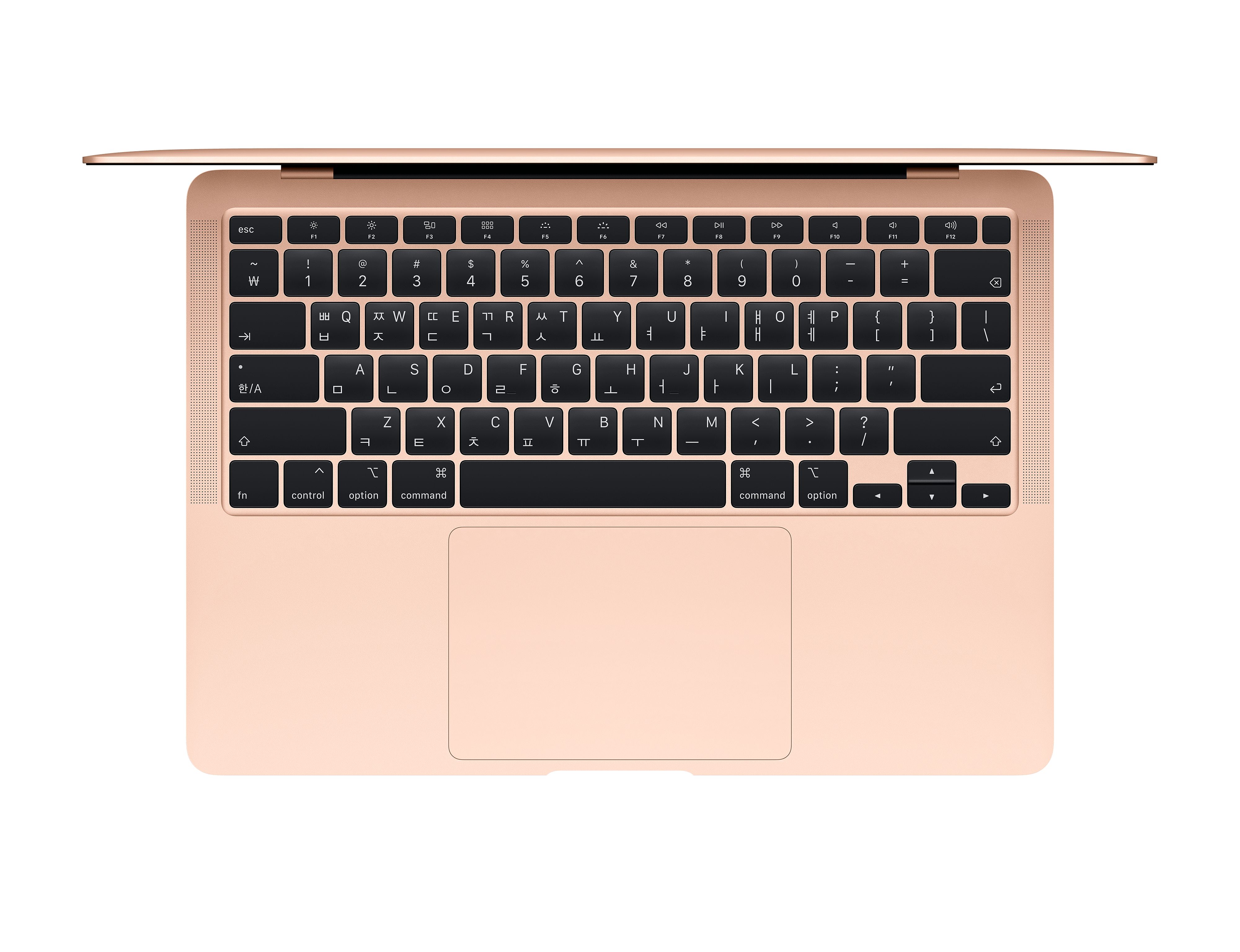 맥북에어 13인치 2020의 가장 큰 개선이라고 할 수 있는건 뭐니뭐니해도 키보드입니다. 맥북프로 16인치 제품에 적용된 가위식 키보드 메커니즘이 맥북에어 13인치 2020에도 탑재되었습니다. 키 스트로크가 나비식의 0.45mm에서 늘어난 1mm가 적용되어 좀 더 편안하고 조용한 키보드 타격감을 제공합니다. 예전 맥북프로 레티나 시절의 키감과 비슷해졌다는 평가가 많이 있습니다.