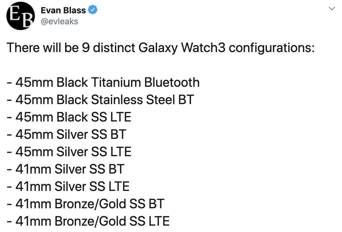 에반 블라스(Evan Blass)는 자신의 트위터에 갤럭시 워치 3의 예상 라인업과 예상 가격에 대한 정보를 공개했습니다. (링크 : 에반 블라스 트윗)