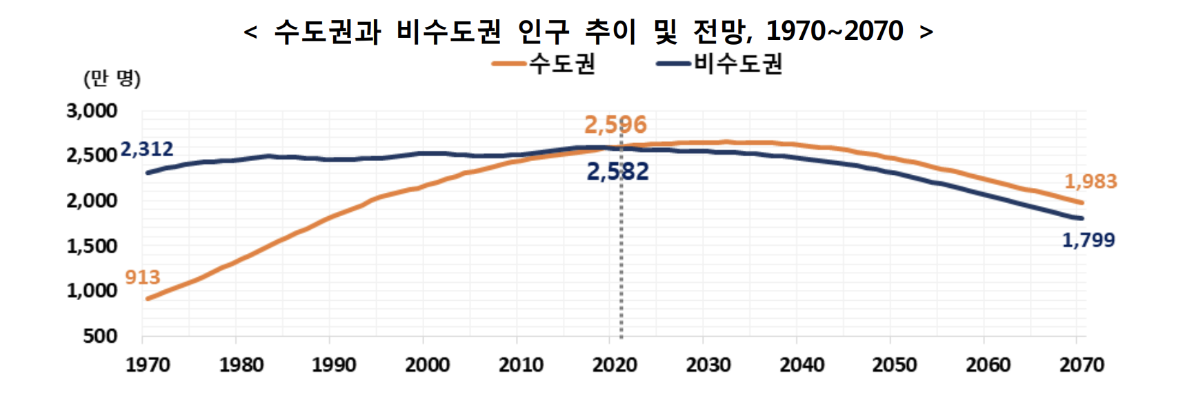 2020년 처음으로 비수도권 인구를 추월한 수도권의 인구는 2032년 2650만명을 정점으로 다시 감소할 예정입니다. 2070년에는 1983만 명에 이르러 향후 50년 동안 23.6%가 감소할 것으로 전망되었습니다.