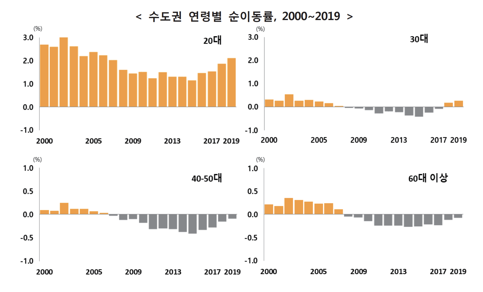연령대별로 분석한 자료도 나왔는데요. 20대의 인구 유입은 최근 20년간 지속되어 왔습니다. 30대의 경우 2008년부터 순 유출로 전환되었다가 2018년 다시 순유입으로 전환되었습니다. 40대 이상의 경우 2008년부터 지속적으로 순유출되고 있습니다.