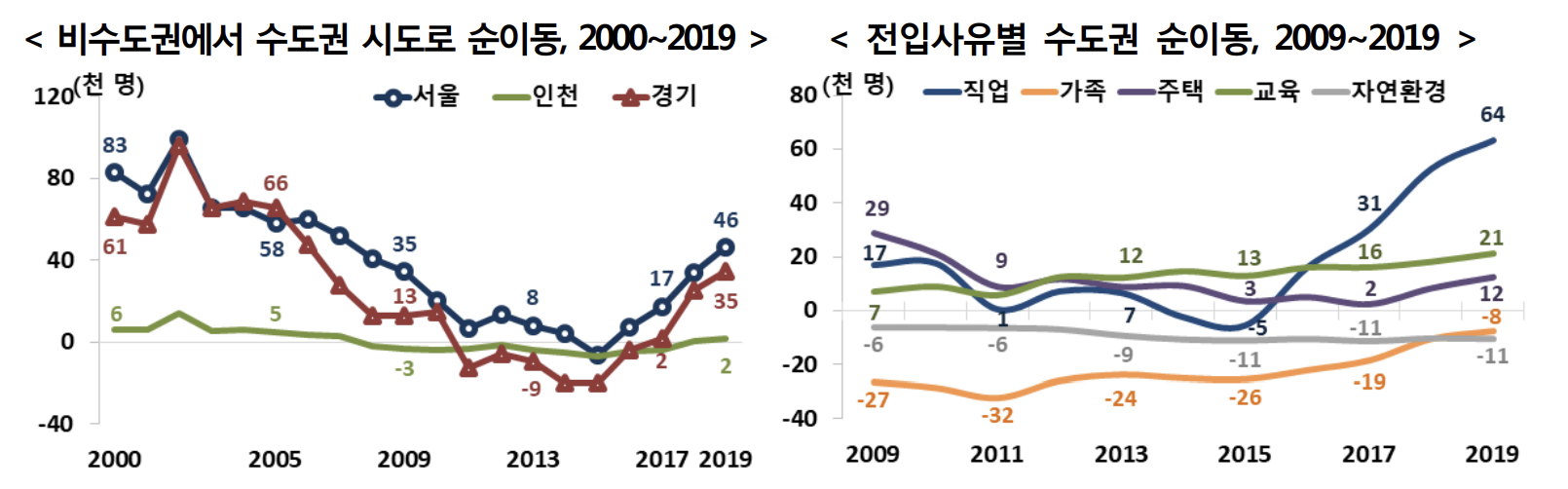 수도권으로의 인구 유입은 2011년 최초로 순유출로 전환되었다가 2017년 다시 순유입으로 전환되었습니다.