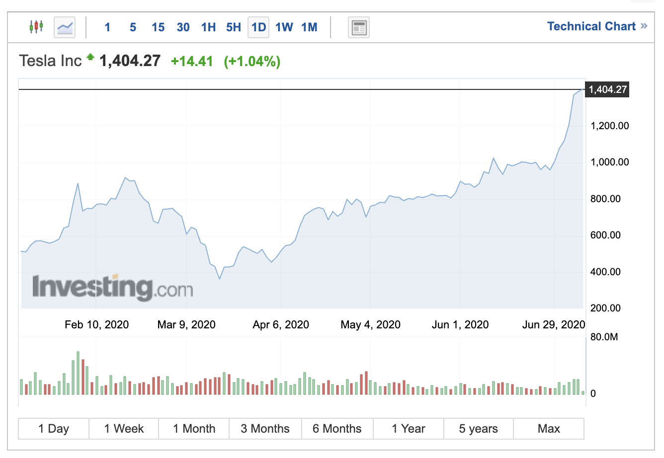 최근들어 테슬라의 주가가 무섭게 상승하고 있습니다. 지난해 7월 230달러(약 27만원)의 가격에 살 수 있었던 테슬라 주식은 1년만에 5배 이상 뛰어 $1,371.58(약 163만 4000원) 가량합니다. 증권가의 테슬라 담당 애널리스트들은 테슬라의 주가가 $2,000까지 상승할 수 있다는 의견을 내기도 했습니다.