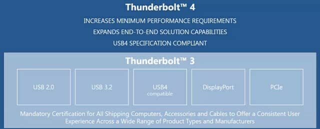 PC나 주변기기가 인텔의 '썬더볼트 4'의 인증을 통과하기 위해서는 4K 디스플레이 2개 혹은 8K 디스플레이 하나를 연결할 수 있어야 하며, 데이터 입출력 속도 역시 3000MB/s까지 보장되어야 합니다. 썬더볼트 인증을 받으려면 인텔에 인증 비용을 지불해야하며, 이 때문에 썬더볼트를 지원하는 주변기기들의 가격이 비싸진다는 평가도 있습니다.