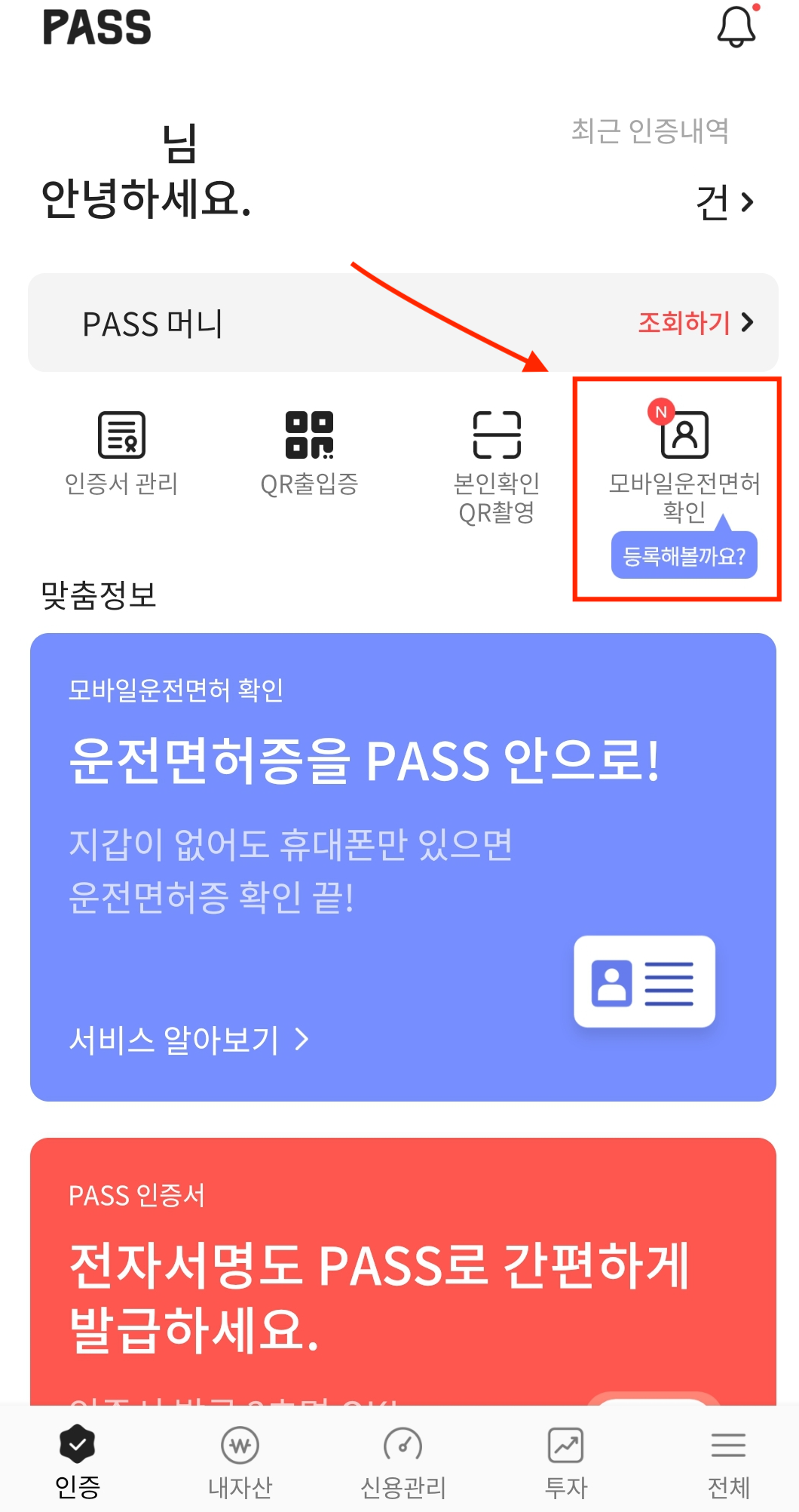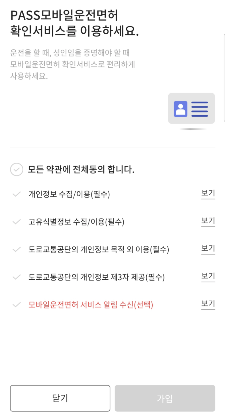 3. PASS 앱 오른쪽에 있는 '모바일운전면허 확인' 버튼을 눌러서 등록 절차를 진행합니다. 필수 약관에 동의를 하시고, ‘가입’ 버튼을 누릅니다
