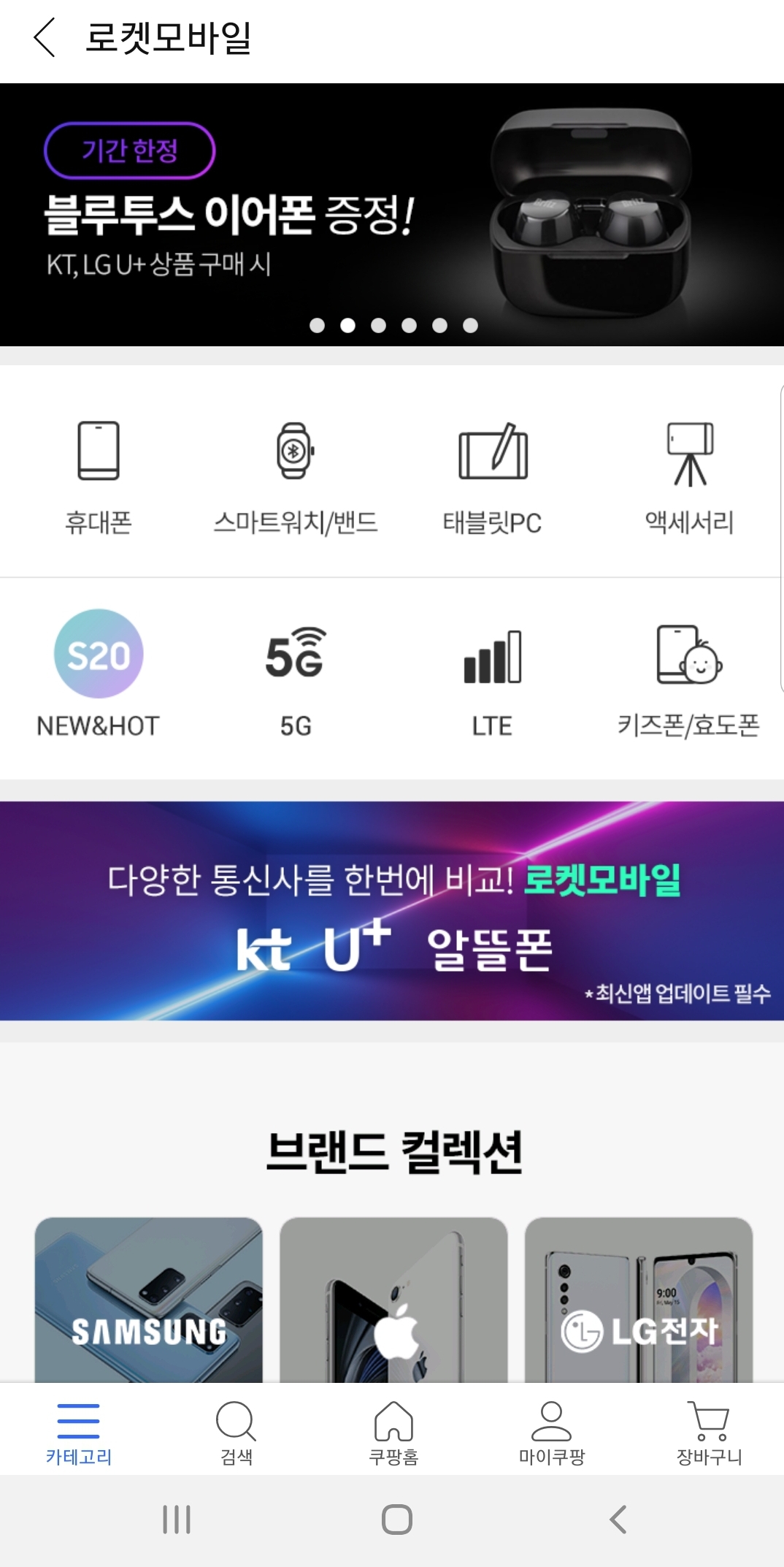 쿠팡의 로켓 모바일의 런칭으로 사용자는 쿠팡을 통해 자급제 스마트폰뿐만 아니라 KT, LG U+, 알뜰폰 등 다양한 통신사들을 로켓 모바일 서비스에서 비교해보고 가입할 수 있습니다. SKT는 일단 빠져있는데, 곧 추가 될것으로 예정되어있다고 합니다.