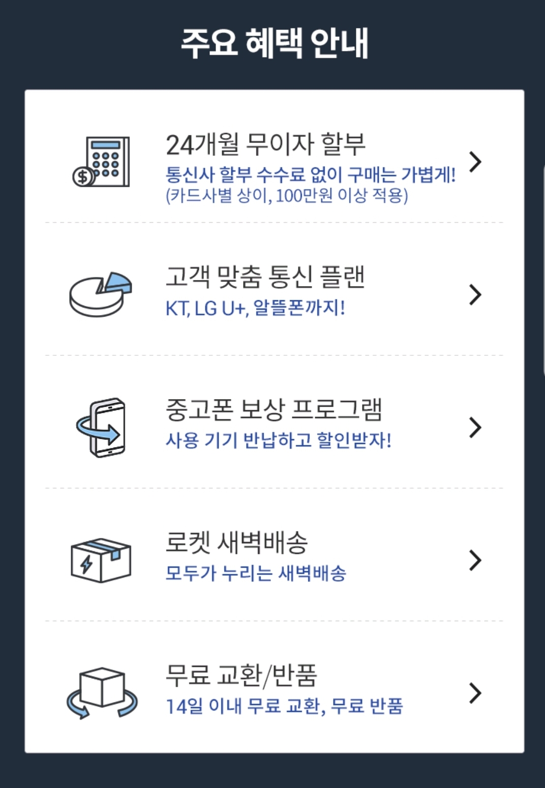 언택트 시대에 맞게 오프라인 통신사 대리점의 역할을 쿠팡 모바일 앱에 그대로 옮겨 놓은 모습입니다. 거기에 제휴 카드를 통한 추가 혜택도 만나볼 수 있어 스마트폰을 바꾸고자하는 사용자들에게 좋은 혜택을 줄 수 있는 서비스로 보입니다.