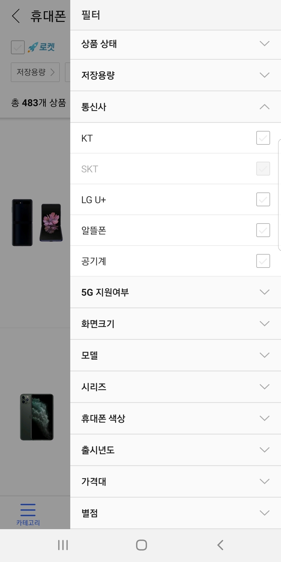 '로켓 모바일' 메뉴를 선택하면 휴대폰은 물론이고 스마트워치/밴드, 태블릿 PC 등 제품을 선택할 수 있고, 5G, LTE 등 통신 관련 옵션도 선택할 수 있습니다.