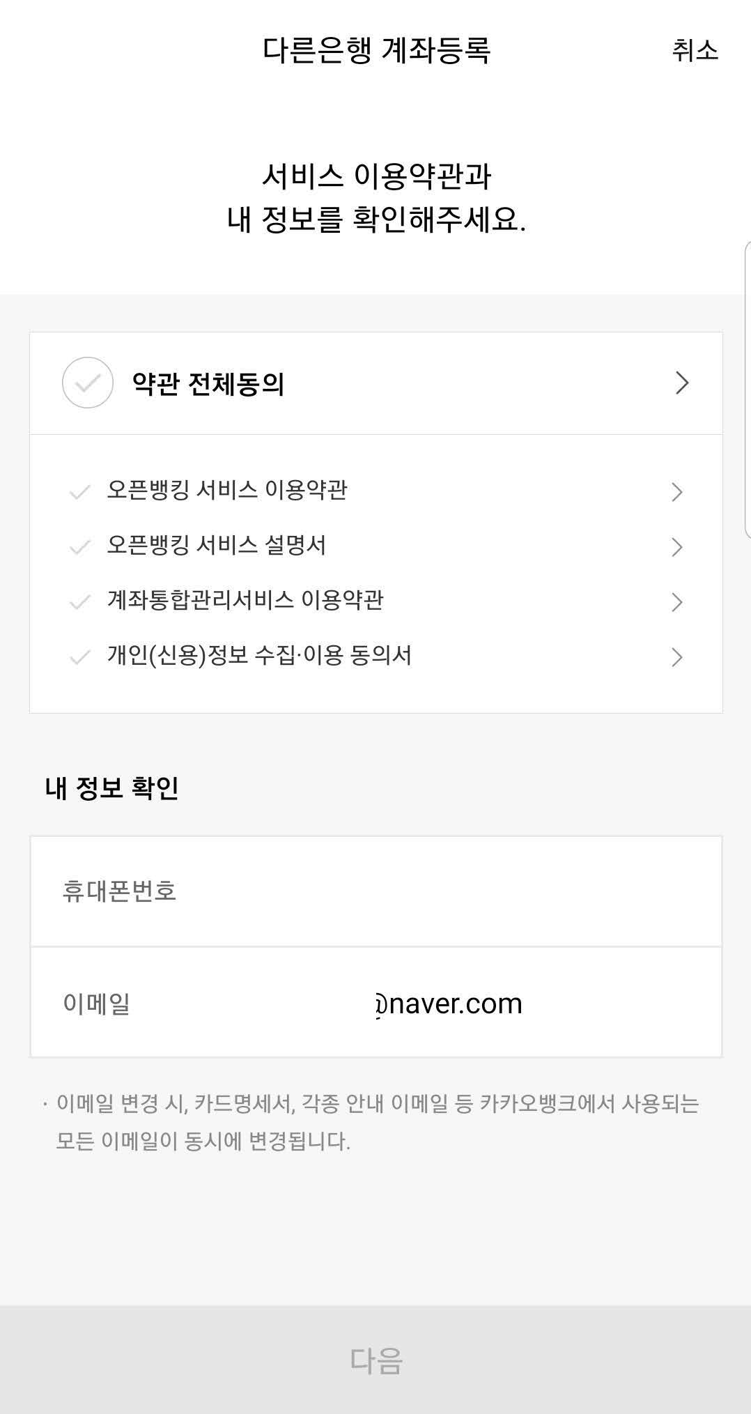 모든 계좌를 한눈에 볼 수 있는 오픈뱅킹에 대한 안내가 나오고 서비스 약관 동의를 받습니다.