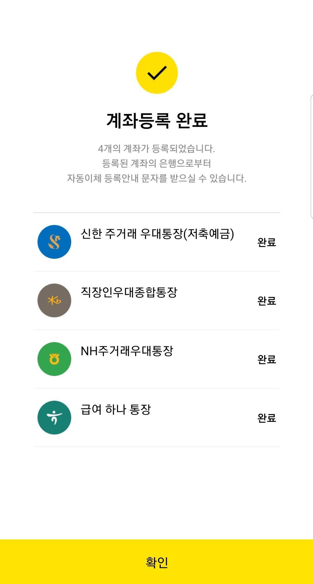 카카오 뱅크에 등록할 계좌를 선택하고 약관 동의를 하고 비밀번호를 입력하면 오픈뱅킹 등록을 할 수 있습니다.