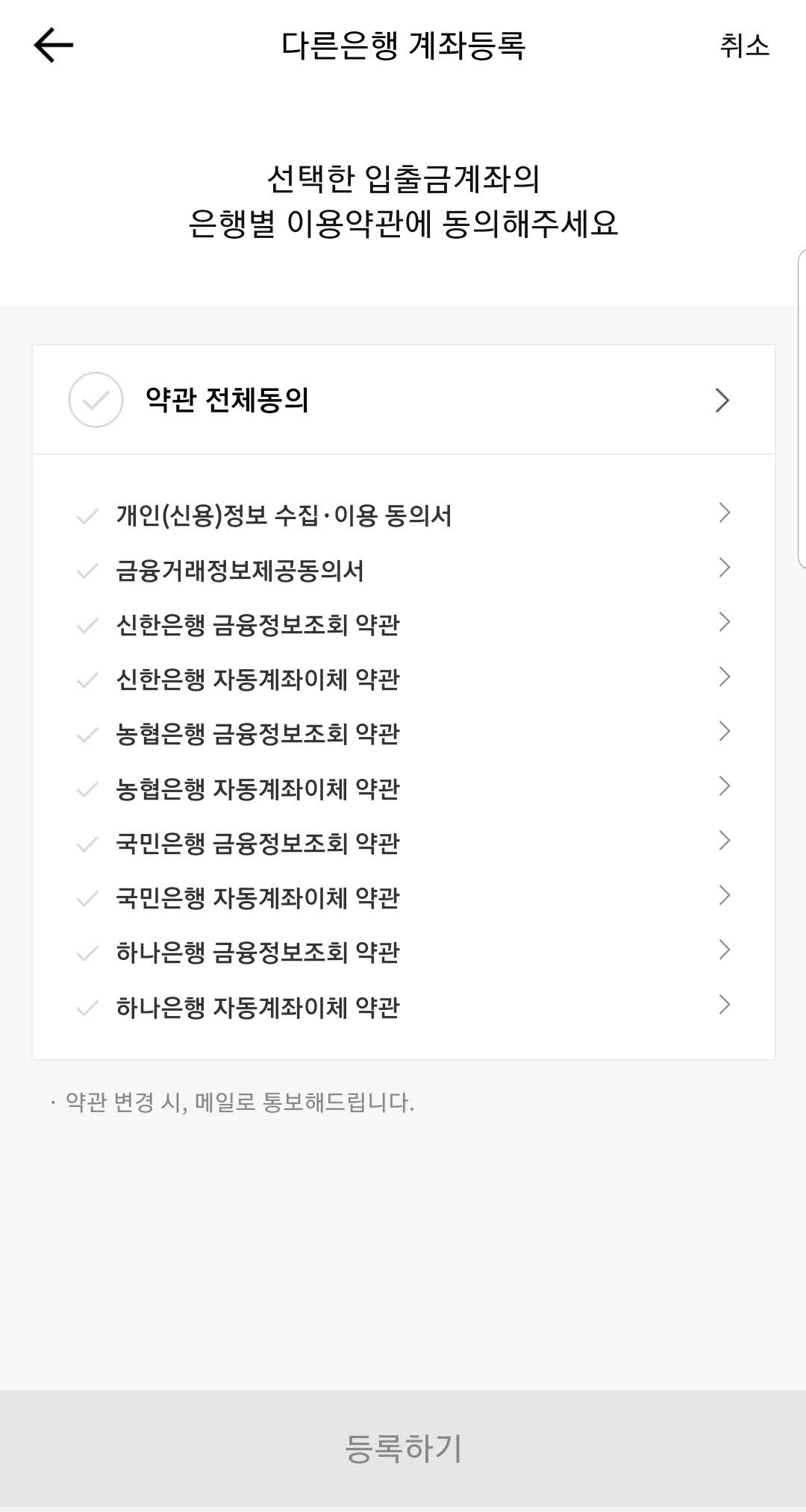 카카오 뱅크에 등록할 계좌를 선택하고 약관 동의를 하고 비밀번호를 입력하면 오픈뱅킹 등록을 할 수 있습니다.