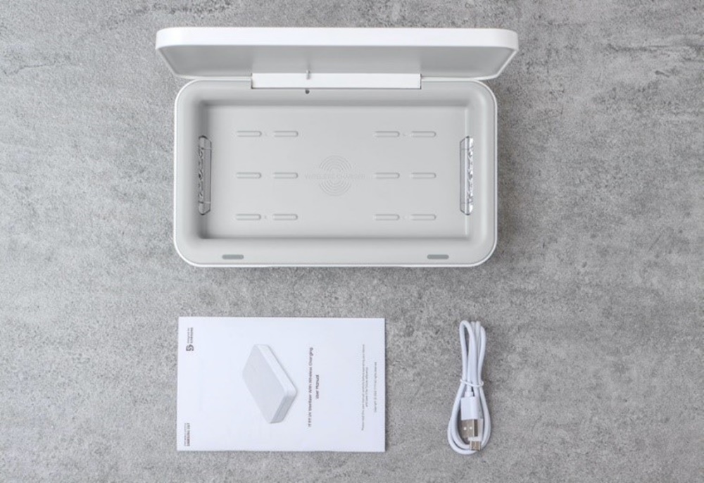 살균기에 넣은 물건의 위 아랫부분을 모두 소독할 수 있도록 자외선이 위 아래 양쪽에서 나오도록 했습니다. 물건을 살균하는데 걸리는 시간은 10분 내외라고 하며, 그 동안 스마트폰 무선충전기로 사용할 수 있습니다.