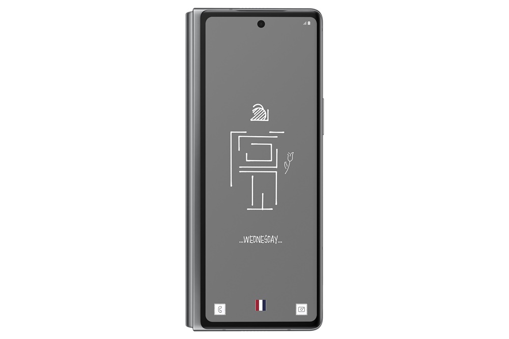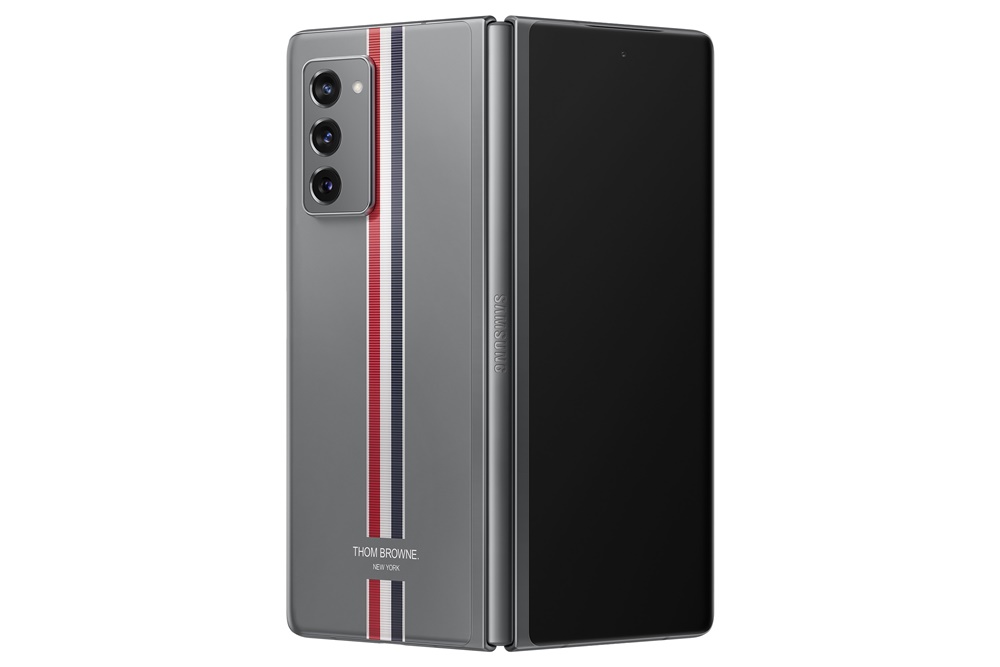 '갤럭시 Z 폴드2 톰브라운 에디션'의 외관 디자인은 톰브라운 특유의 디자인이 더욱 강조되도록 톰브라운 그레이 색상에 멀티컬러 스트라이프 패턴을 실제 원단과 같은 질감으로 후면 글래스에 구현했습니다.